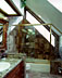 Upstairs, the sunset lakeview balcony (the cottage faces due east) has a sheltering roof which is low enough to be touched at its eaves. To avoid two-story massing which would compete with the main ranch house, each of the two bedrooms is nested in a gable, offering the attic-like charm of sloping ceilings and a large semicircular window at the ends. Each bedroom has a beautiful private bath of warm brown marble, with original stained glass doors. Above each tub, trapezoid windows follow the slope of the front porch roof, providing a view of trees and sky while retaining privacy.
