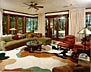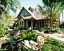 This 2,200 square foot guest cottage echoes the Craftsman style of the owner's original residence with its cedar columns and beams, stonework (Californian "desert driftwood" from the Mohave Desert), and mitered glass. The cottage is free standing, and relates to the main house from a distance by lavish landscaping and water features: falls, streams and a rocky, spring-like pool.